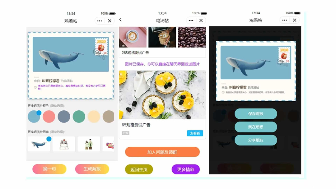 基于多骨鱼平台开发,我们不仅保留了核心的海报生成功能,还进行了创新性拓展。新增了保存和分享完成页面的精美设计,以及优化了用户分享卡片后的跳转体验,每个环节都旨在提升用户体验和留存率。