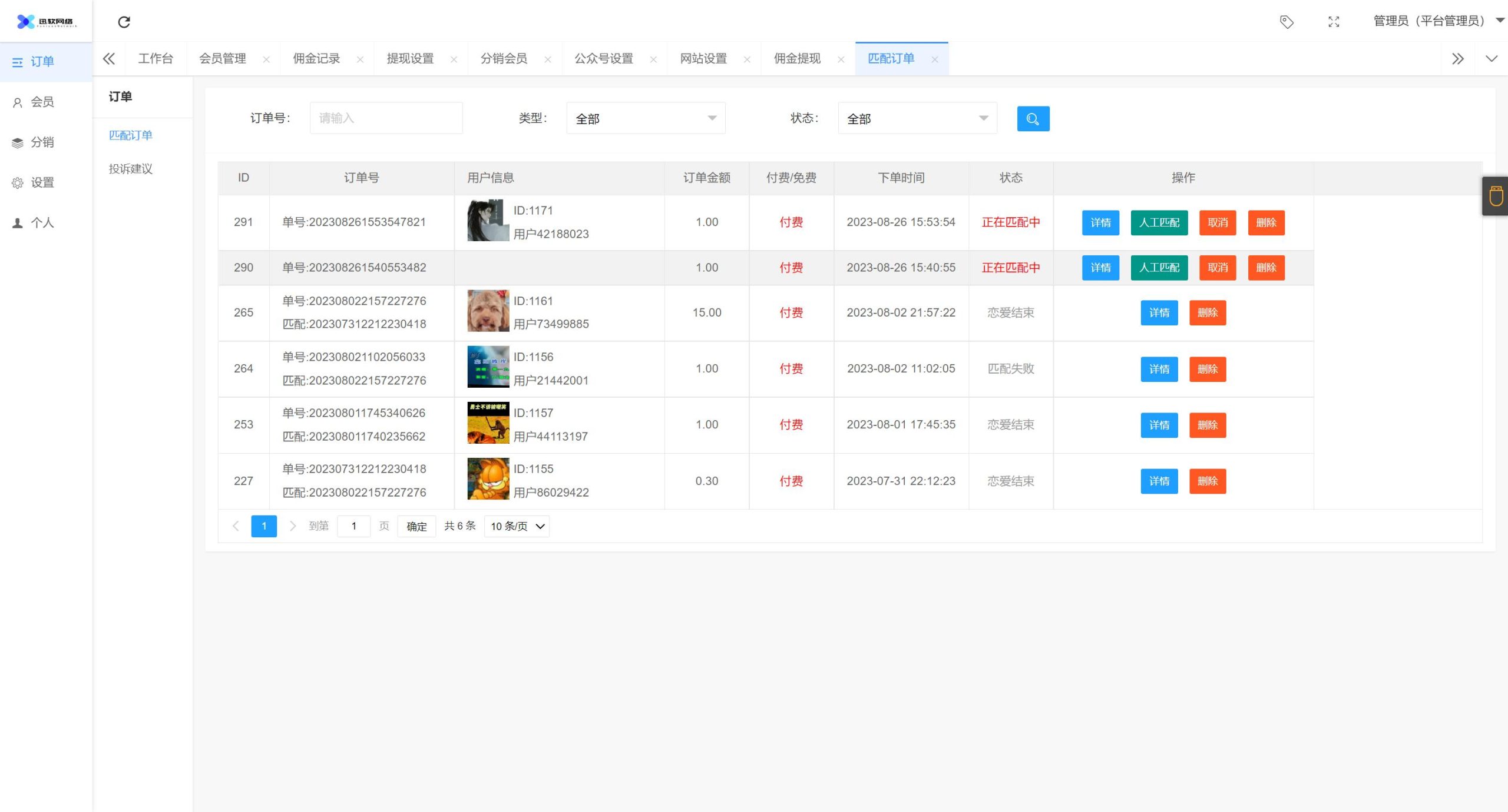 - 多种匹配方式:后台支持多种匹配方式,当用户数量增多之后,可以自动匹配,方便快捷。