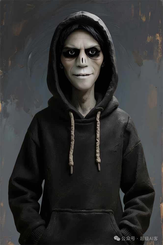 ***男子正对镜头,他的皮肤,是用厚涂技法(impasto)的油彩渲染出的病态惨灰白色,这个男子穿着一件黑色连帽衫)。 强烈的明暗对照效果(Chiaroscuro)将他孤独的身影置于画面的视觉中心。